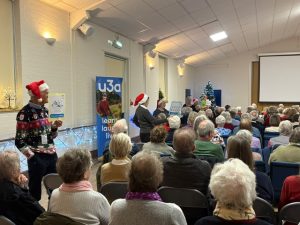 Our Christmas event on the 9th December was attended by 154 members and two visitors who admired the festively decorated hall. They enjoyed a very informative and, at times, amusing talk titled “Christmas Celebrations through History Revealed” by Dr. Jill Eyers. This was followed by some carol singing and a rousing version of The Twelve Days of Christmas in which different segments of the audience sang different lines. Everybody found that great fun! As usual this was followed by prosecco, sausage rolls, mince pies and delicious christmas cake. Further photos can be seen in the Gallery.